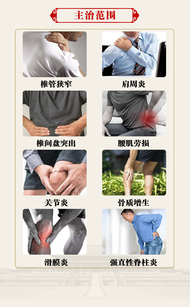 • 椎管狹窄癥、腰椎間盤(pán)突出膨出、頸椎病、骨性膝關(guān)節(jié)炎、膝關(guān)節(jié)創(chuàng)傷性滑膜炎、類(lèi)風(fēng)濕性關(guān)節(jié)炎、強(qiáng)直性脊柱炎、股骨頭壞死、關(guān)節(jié)強(qiáng)直、第三腰椎橫突綜合征、髂腰韌帶損傷、頭頸軀干部位軟組織損...